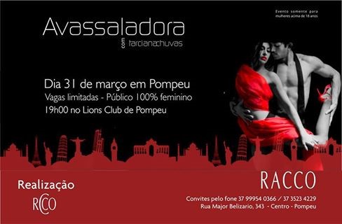 MAIS DE MIL ( 1.000 mulheres de Pompéu, Pitangui, Martinho Campos), participaram e estiveram presentes ao último evento proferido pela Educadora Sexual TARCIANA CHUVAS. Perguntem-nas o que elas acharam da palestra da sexóloga.. Os números não mentem. Para este próximo evento, estarão presentes beldades de Luz, Abaeté, Dores e Ibitira. |
